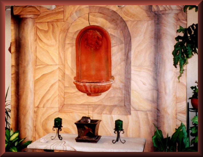 Mural painted for client on patio wall to frame existing wall fountain Wall Dimensions: 2.5 Metres x 3.2 Metres (8' x 10.5')