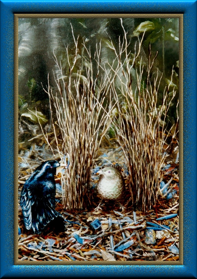 'The Engagement' - Satin Bower Birds Oil on Canvas 58.5cm x 80cm / 23.4in x 32in Unframed (Shown framed for display purposes) E-mail for price